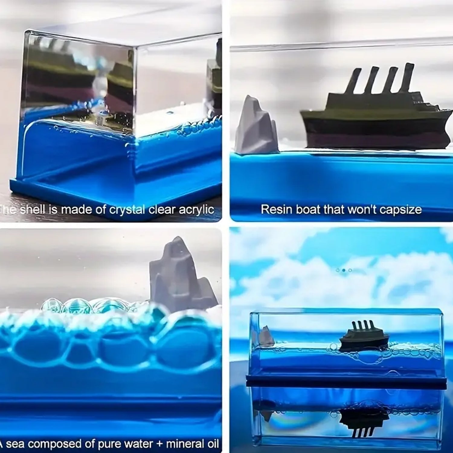 • Unsinkable Cruise Ship – This Liquid Motion Ornament the Outer Material is Acrylic, The Titanic are Resin, The Seawater is Pure Water and Vegetable Oil to Ensure that it will Never Sink.