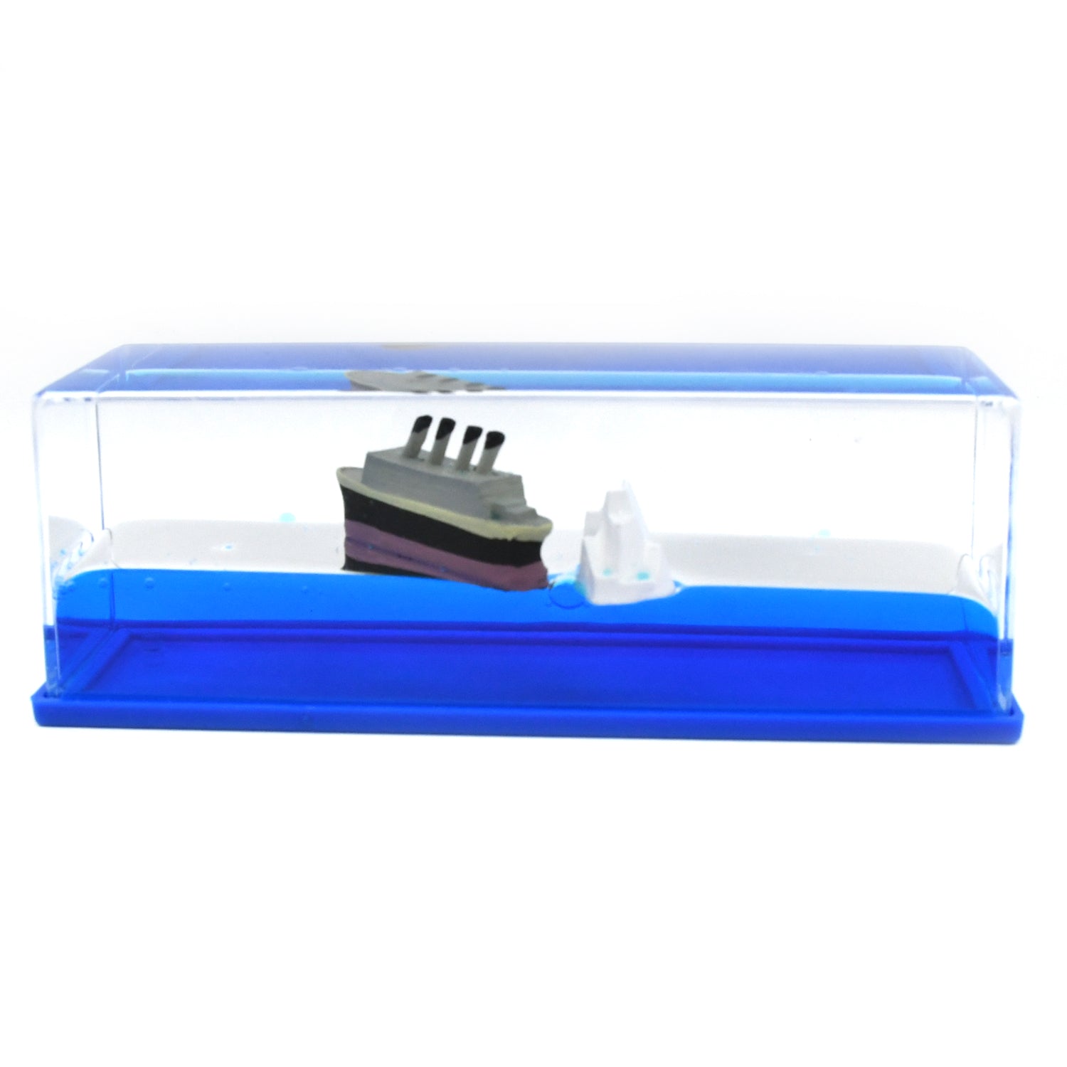 • This desk toy has a clear exterior and the inside is filled with soothing blue liquid, a floating titanic and an iceberg. You can gently tilt the paperweight to experience a soothing, stress relieving experience. Great for providing relief for kids and adults who suffer from anxiety.