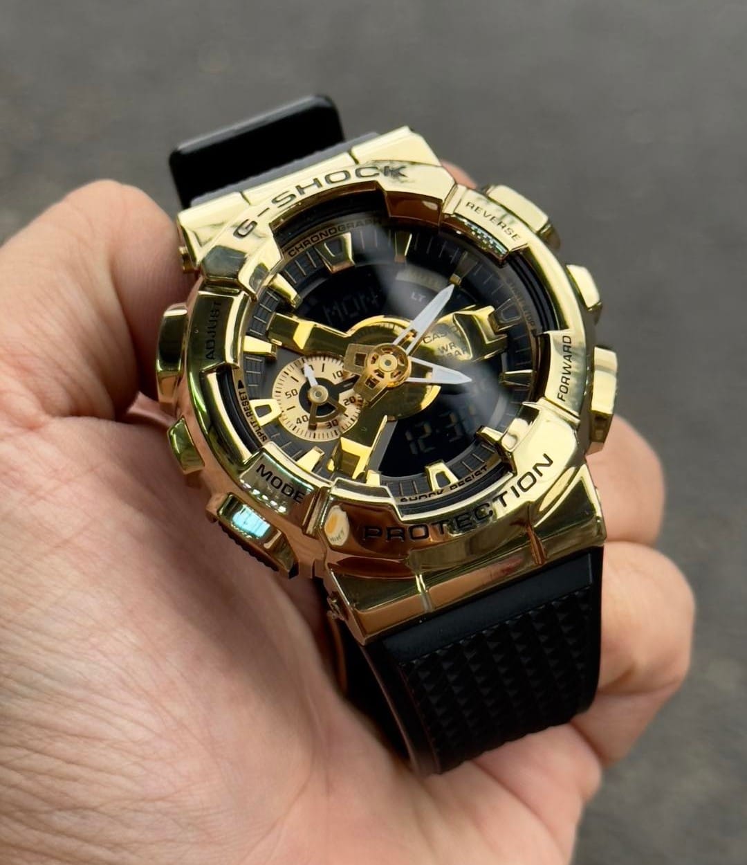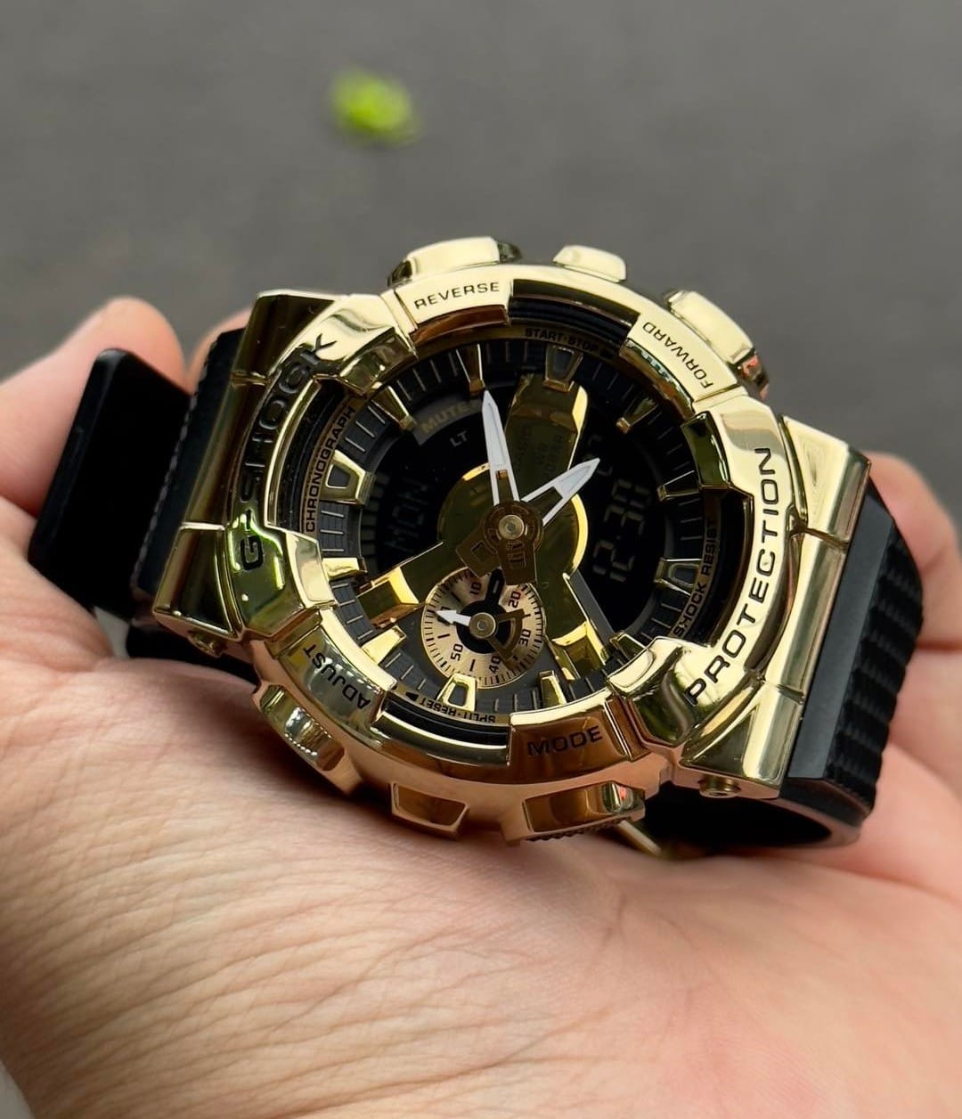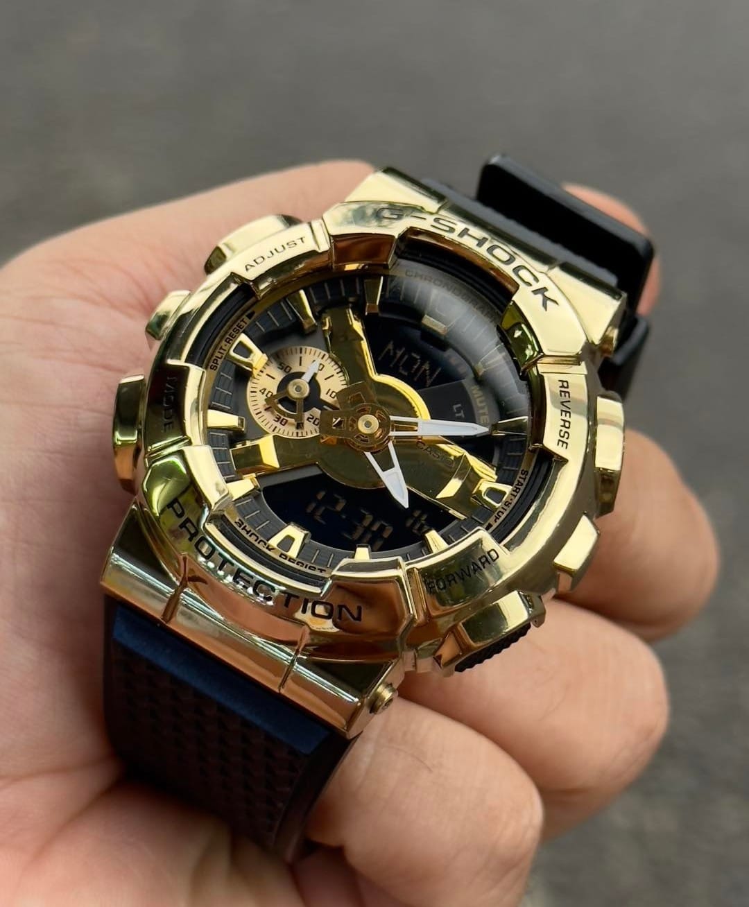 - Metal-Covered Shock-Resistant Structure: Glass Fiber Reinforced Resin Inner Case: Forged and Molded Bezel:Â World Time: Stop-Watch: Gold Ion Plated Case